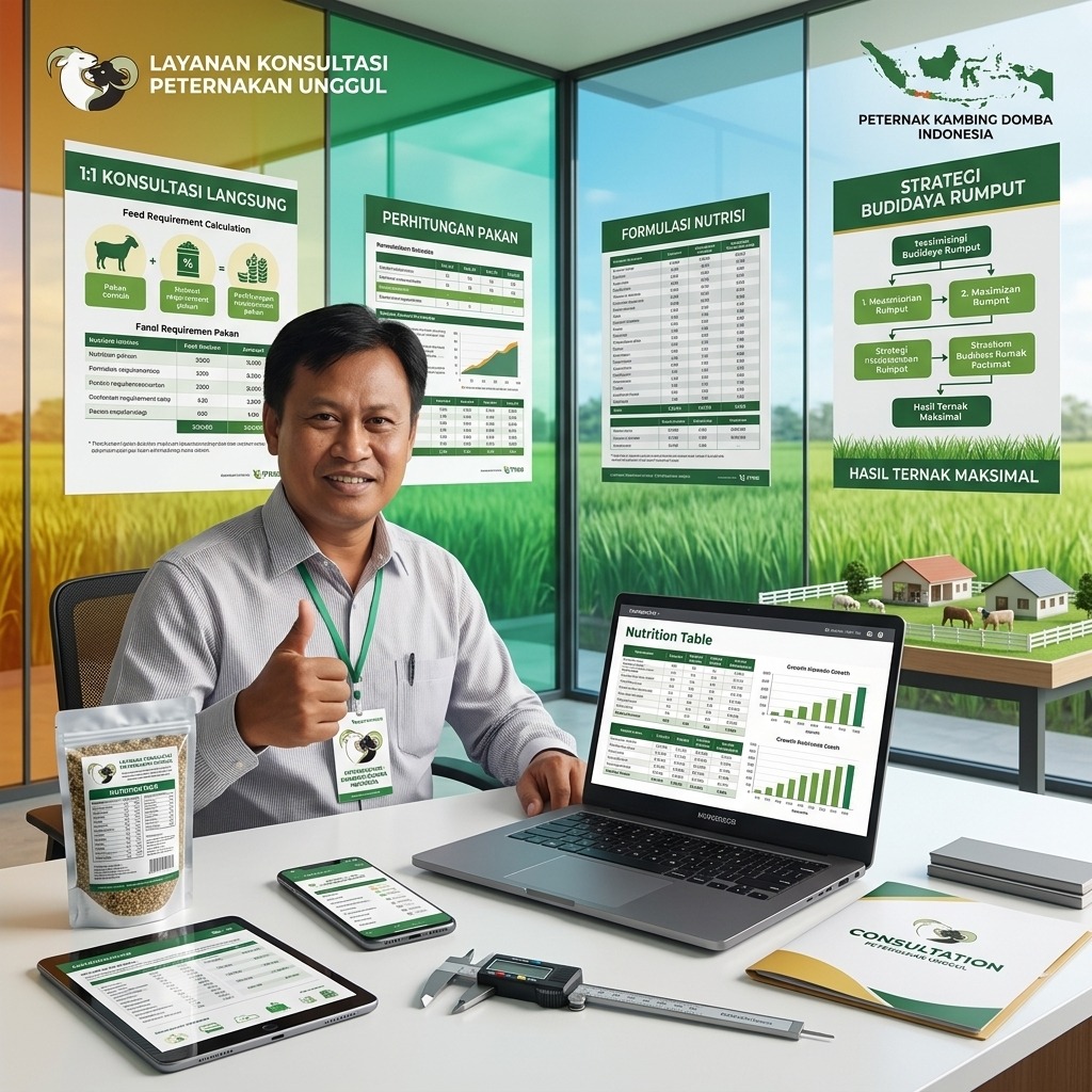 Layanan konsultasi langsung untuk menghitung kebutuhan pakan, formulasi nutrisi, dan strategi budidaya rumput agar hasil ternak maksimal.