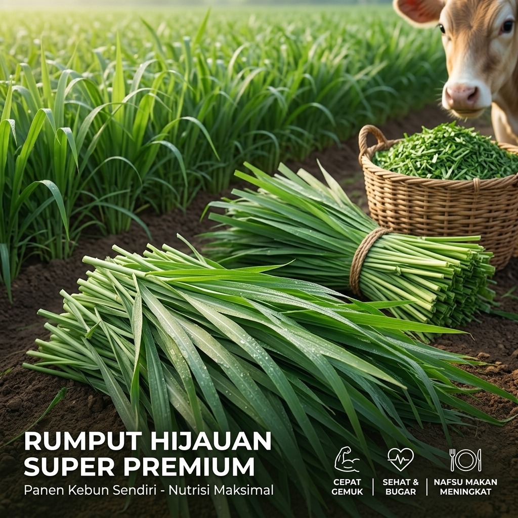 Rumput hijauan berkualitas tinggi, dipanen langsung dari kebun sendiri. Kaya nutrisi, membantu ternak lebih cepat gemuk, sehat, dan nafsu makan meningkat.
