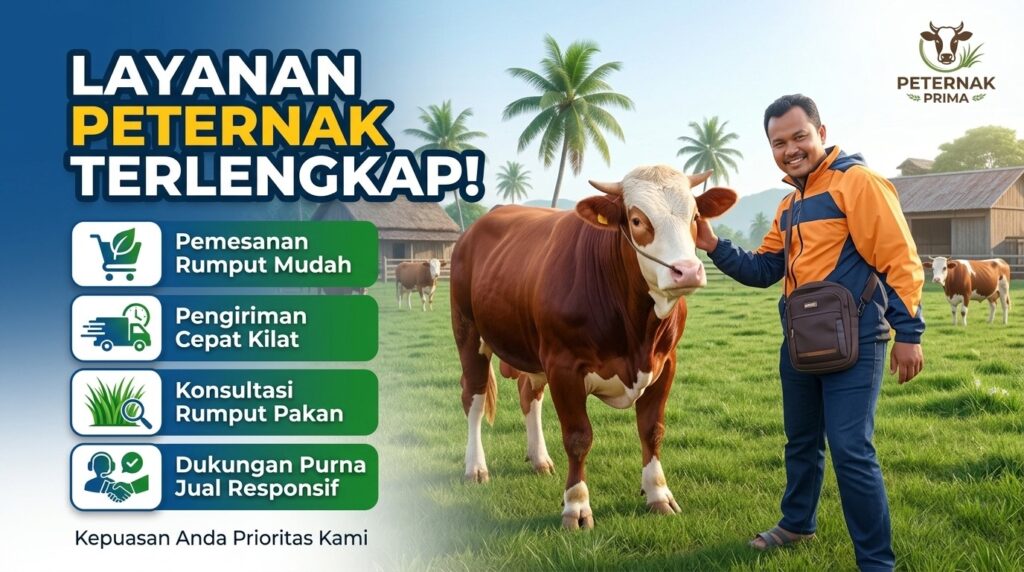 Kami berkomitmen memberikan layanan terbaik bagi setiap peternak, mulai dari pemesanan rumput pakan yang mudah, pengiriman cepat, hingga dukungan purna jual. Tim kami siap membantu memilih rumput yang sesuai kebutuhan ternak, memastikan kualitas tetap terjaga, dan menjawab setiap pertanyaan dengan responsif, sehingga kepuasan pelanggan selalu menjadi prioritas utama kami.
