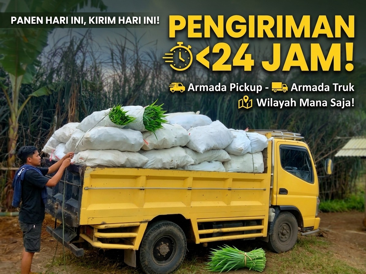 Pengiriman rumput pakan dilakukan maksimal 24 jam setelah panen untuk menjaga kesegaran. Tersedia pengiriman ke berbagai wilayah dengan armada pickup atau truk, menyesuaikan jumlah pesanan.